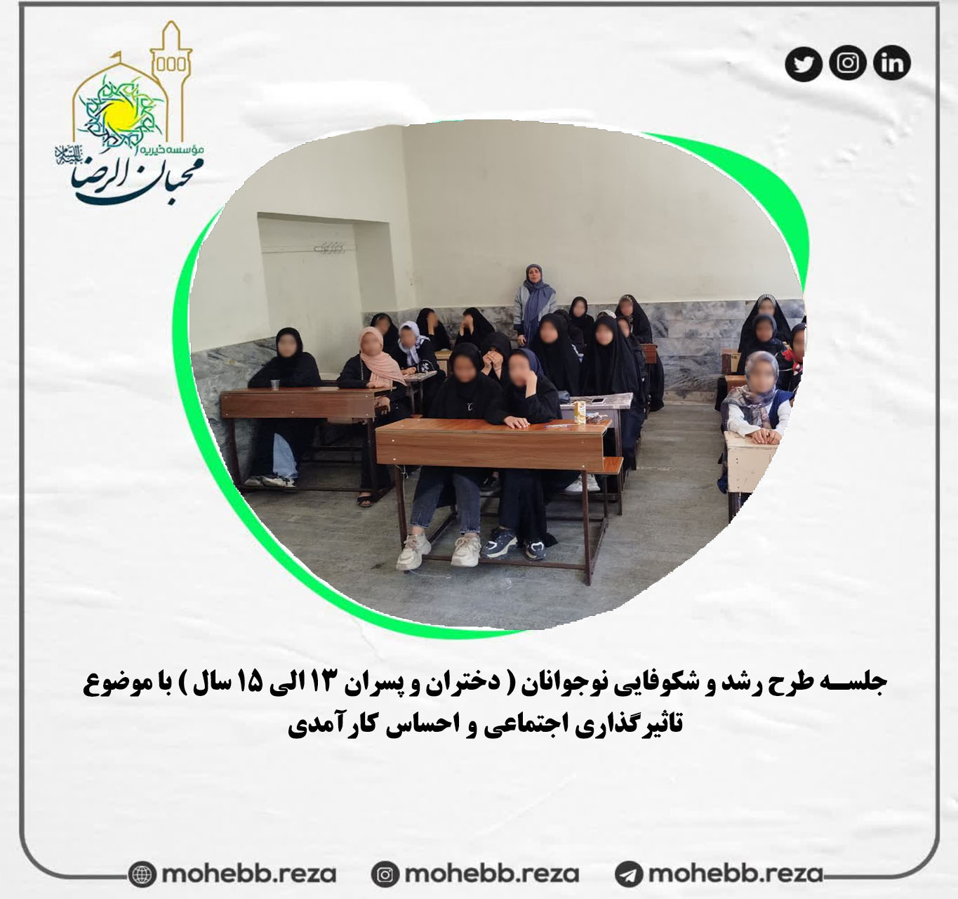 جلسه ی طرح رشد و شکوفایی با حضور نوجوانان دختر و پسر ۱۳ الی۱۵ ساله با موضوع تاثیرگذاری اجتماعی و احساس کارآمدی برای ۸ گروه آموزشی و با حضور ۳۱۳ نفر (۱۲۰ پسر و ۱۹۳ دختر ) با هدف نهادینه سازی منش های محبان، توسعه دانش و مهارت نوجوانان، ارتقای خلاقیت و مشارکت بیشتر فرزندان در فعالیت های علمی آموزشی و همچنین هدفمند سازی کمک های خیرین در محل مؤسسه برگزار گردید.