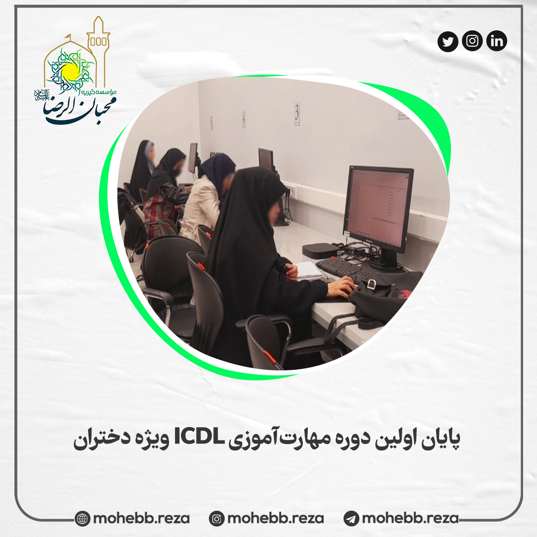 نخستین دوره آموزشی مهارت‌های هفت‌گانه کامپیوتر(ICDL)  ویژه دختران تحت پوشش خیریه محبان‌الرضا(ع) با موفقیت به پایان رسید. این دوره با تدریس استاد گرانقدر جناب آقای یاسین‌زاده، در قالب ۲۵ جلسه آموزشی ، بصورت سه جلسه در هفته (هر جلسه دو ساعت) برگزار شد. هدف از اجرای این دوره، توانمندسازی دختران برای ورود مؤثرتر به بازار کار، افزایش مهارت‌های دیجیتالی و آمادگی جهت شرکت در فرصت‌های شغلی مختلف بود. در پایان دوره، تمامی شرکت‌کنندگان جهت شرکت در آزمون‌های کتبی و عملی سازمان فنی و حرفه‌ای معرفی شدند تا در صورت موفقیت در آزمون ها،گواهینامه معتبر خود را دریافت نمایند.