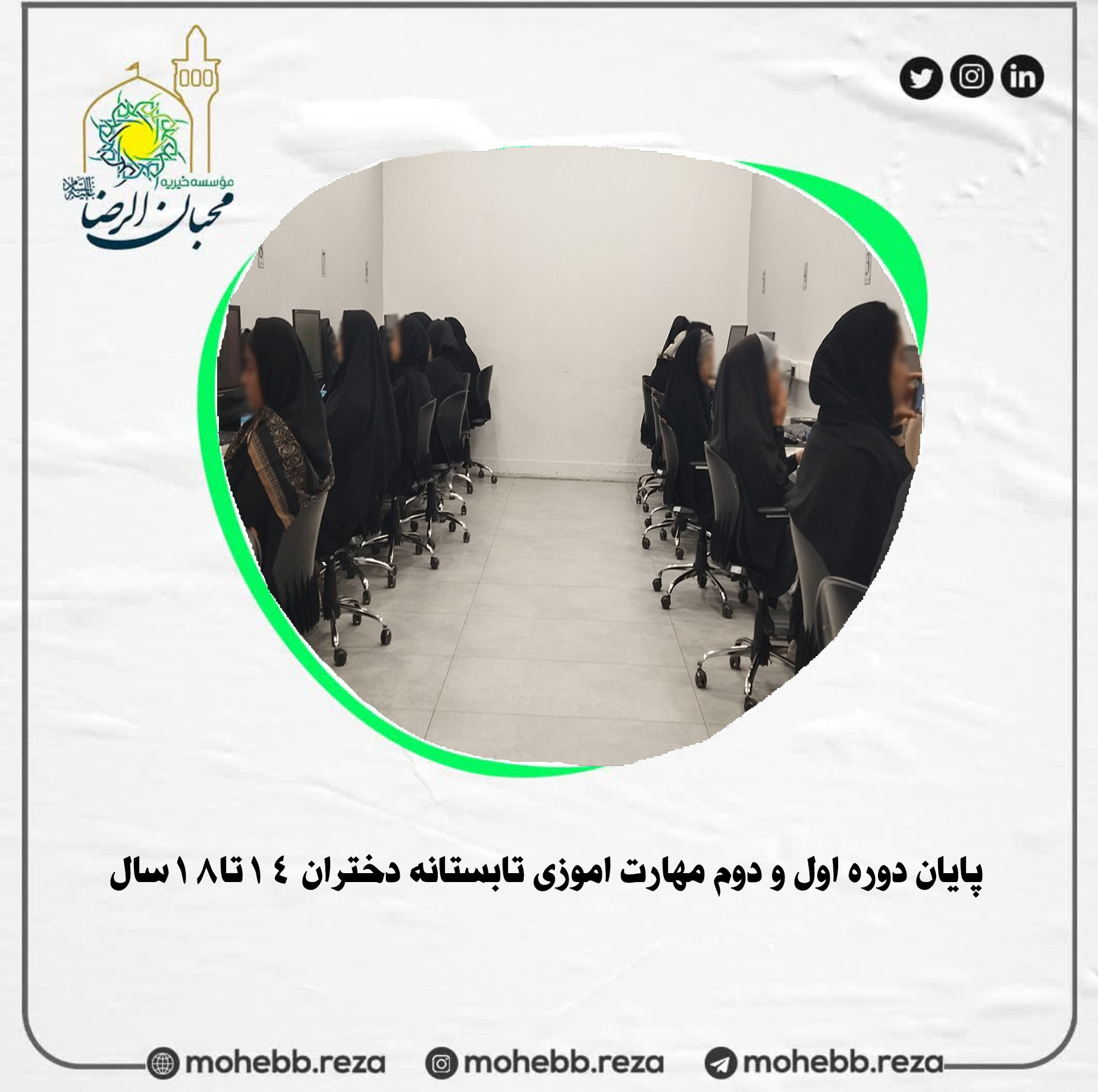 با هدف ارتقای مهارت‌های فردی و حرفه‌ای نوجو انان و استفاده بهینه از اوقات فراغت ، اولین دوره‌ی مهارت‌آموزی تابستانه دختران ۱۴ تا ۱۸ سال با حضور ۳۵ نفر در دو کد ۱۷نفره و ۱۸نفره با حضور جناب آقای یاسین‌زاده( کارشناس ارشد علوم کامپیوتر) و سرکار خانم سهندی ( مربی مجرب هنرهای دستی و تزئینی) به مدت ۱۳روز از ساعت ۸:۳۰ تا ۱۲:۱۵ برگزار گردید