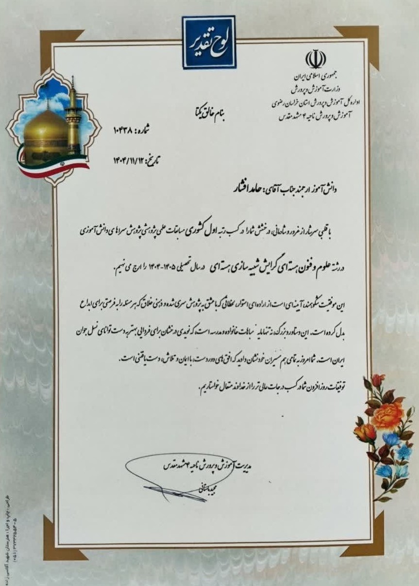 این دانشآموز نخبه در سال تحصیلی ۱۴۰۴-۱۴۰۵، در رشته علوم و فنون هستهای با گرایش تخصصی شبیهسازی هستهای به رقابت پرداخت و با ارائه پژوهشی برجسته، حکم رتبه اول کشوری را از آن خود کرد. این موفقیت گامی بلند در ارتقای جایگاه علمی دانشآموزان کشور در حوزههای راهبردی و پیشرفته محسوب میشود.