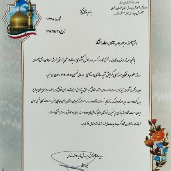 کسب مقام اول مسابقات ملی پژوهشسراها؛ درخشش دانشآموز «محبان الرضا (ع)» در علوم هستهایMohebbanrezaبهمن 25, 1404حامد افشار، دانشآموز موسسه «محبان الرضا (علیهالسلام)»، موفق شد در مسابقات ملی پژوهشسراهای دانشآموزی، به عنوان رتبه ... ادامه مطلب