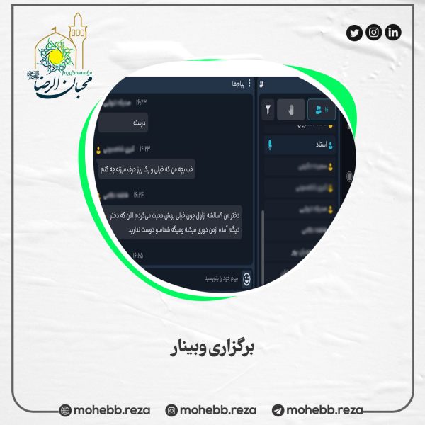 برگزاری وبینار Mohebbanrezaفروردین 31, 1404یک جلسه آموزشی (وبینار) با موضوع ” اصول فرزند پروری در سال های اول زندگی۱″ برای خانواده ... ادامه مطلب